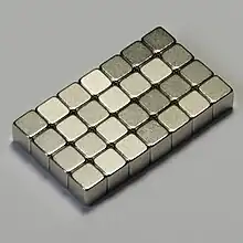 Un imán de neodimio (también conocido como iman NdFeB, NIB, o Neo) es el tipo de imán de tierras raras más extensamente utilizado;[1] se trata de un imán permanente hecho de una aleación de neodimio, hierro y boro, combinados para formar un compuesto que cristaliza en el sistema cristalino tetragonal[2] con la fórmula empírica Nd2Fe14B. Fue desarrollado en 1982 por General Motors y la división de metales especiales de la Sumitomo Metal Industries. Los imanes de neodimio son el tipo de imán permanente de mayor potencia hecho por el ser humano.[3][2] Han reemplazado a otros tipos de imanes en muchísimas aplicaciones de la industria moderna que requieren imanes permanentes de gran potencia; aplicaciones tales como la fabricación de motores en herramientas inalámbricas, discos duros, y sellos magnéticos.