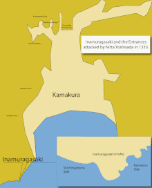 Se cree que Nitta debe haber aprovechado la marea baja para ingresar a Kamakura y capturarla.[2] Bypassing the cape on foot would be impossible today even at an extraordinarily low tide and its base is always entirely under water but, according to old texts, sea level there was lower a thousand years ago and a narrow strip of land regularly appeared at low tide. El Azuma Kagami afirma que el 21 de septiembre de 1181, el shōgun Minamoto no Yoritomo fue a Inamuragasaki debido a un concurso de tiro con arco que iba a tener lugar en su playa.[1]