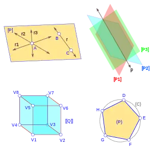 Ahora, se fija una base de V de modo que se puedan describir sus vectores como tripletas de coordenadas (con respecto a esa base). Un subespacio vectorial unidimensional consta de un vector distinto de cero y todos sus múltiplos escalares. Los múltiplos escalares distintos de cero, escritos como tripletes de coordenadas, son las coordenadas homogéneas del punto dado, llamadas coordenadas de punto. Con respecto a esta base, el espacio solución de una única ecuación lineal {(x, y, z) | ax + by + cz= 0} es un subespacio bidimensional de V y, por tanto, una recta de P(V). Esta recta puede denotarse mediante sus coordenadas de recta [a, b, c], que también son coordenadas homogéneas, ya que múltiplos escalares distintos de cero darían la misma recta. También se utilizan ampliamente otras notaciones. Las coordenadas de los puntos se pueden escribir como vectores columna, (x, y, z)T, con dos puntos, (x : y : z) o con un subíndice, (x, y, z)P. En consecuencia, las coordenadas de recta se pueden escribir como vectores fila, (a, b, c), con dos puntos, [a : b : c] o con un subíndice, (a, b, c)L (aunque también se utilizan otras notaciones distintas).