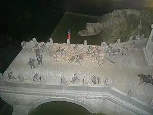 ![]() Recreación en muñecos de museo, de lo ocurrido en el incidente: Tropas del Ejército Nacional Revolucionario defienden el Puente de Marco Polo del desembarco japonés (1937). | ||||