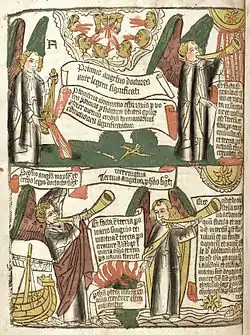 - Biblia pauperum o «Biblia de los pobres», una comparación de las historias del Antiguo y Nuevo Testamento con imágenes, «probablemente destinadas al pobre (o menor) clero más que al pobre laico (o al inexperto)».[19]