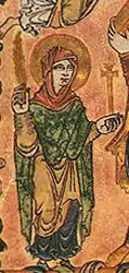 El clero del siglo XI mostraba la cabeza rapada y llevaba sombreros que, según Planché, «se hundían ligeramente en el centro, con los adornos colgantes de la mitra pegados a los lados». Otras prendas de vestir eran la casulla, la vestimenta litúrgica más externa, que conservaba su forma, y la dalmática, una vestimenta similar a una túnica con grandes mangas en forma de campana, que tendía a ser arqueada en los lados. El báculo pastoral era generalmente de color y con ornamento claro.[88]