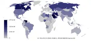 El mundo en general consume 30.000 millones de barriles (4.8 km³) de petróleo por año, y los mayores consumidores son en su mayoría el grupo de naciones más desarrolladas. De hecho, el 24% del petróleo consumido en el año 2004 se le atribuye a Estados Unidos en su totalidad.[2] La producción, distribución, refino y venta del petróleo tomados estos como uno solo, representan la industria más grande en términos de valor en dólares en la Tierra.