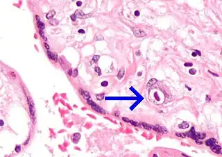 ![]() Micrografía de citomegalovirus (CMV) infección de la placenta (placentitis CMV), una infección de transmisión vertical: El característico gran núcleo de una célula infectada con CMV se ve descentrada en la parte inferior derecha de la imagen, tinción H&E. | ||