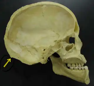 ![]() Sección mediasagital de un cráneo humano. Inion indicado por la flecha amarilla. | ||