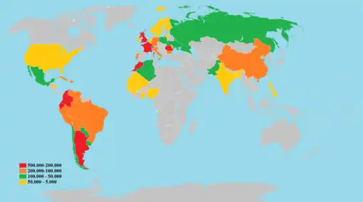 España es, además, el décimo país del planeta que más inmigrantes tiene en números absolutos, por detrás de países como Estados Unidos, Rusia, Alemania, Ucrania, Francia, Canadá o el Reino Unido.[22] En los cinco años posteriores al año 2000, la población extranjera multiplicó por cuatro, asentándose en el país casi tres millones de nuevos habitantes. Según el censo de 2014, el 10,7% de los residentes en España era de nacionalidad extranjera. A causa de la crisis económica que atraviesa España, del 2010 al 2011, se produjo un descenso por primera vez en la historia de 37 056 personas en cifras absolutas.[23]
