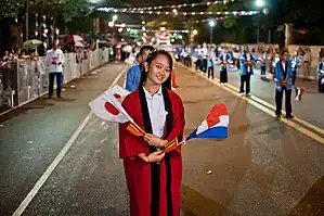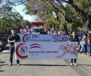 ![]() Jóvenes sansei desfilan en conmemoración del 80.º aniversario de la inmigración japonesa al Paraguay. | ||