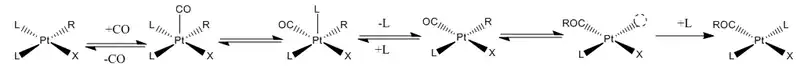 Los derivados de alquilo de complejos planocuadrados dan reacciones de inserción nucleofílica. Estas reacciones de inserción en los complejos plano-cuadrados son de particular interés debido a sus aplicaciones industriales. Como estos complejos planocuadrados son a menudo coordinativamente insaturados, son susceptibles de la formación de aductos pentacoordinados, que se someten a la inserción migratoria fácilmente.[4] En la mayoría de los casos se prefiere la vía de la migración en el plano, a diferencia de la vía nucleófila, que es inhibida por un exceso de CO.[5]
