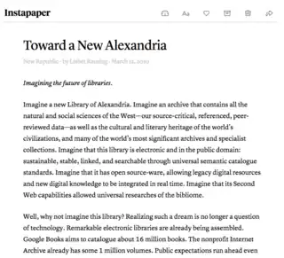 Instapaper es un servicio de marcadores, que permite a sus usuarios guardar contenido web para leerlo después en otros dispositivos,[1] tales como teléfonos inteligentes, tabletas o E-readers.
