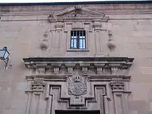 El elemento más destacable es la portada principal, abierta en un lateral de la fachada principal. Ofrece una puerta adintelada y moldurada con baquetones de oreja entre pilastras cajeadas con capiteles compuestos, entablamento con ménsulas decoradas con rosetas, rematadas con flameros y pequeña ventana baquetonada igualmente en oreja y entrecajeadas coronada por un frontón triangular partido con un tímpano con rosetas. El escudo de Carlos III con el toisón de oro completa el conjunto. Este escudo debió de sustituir al de los jesuitas después de la expropiación. Sobre la portada había una espadaña de forja con una campana, la cual fue retirada en la última restauración.