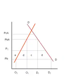 Se consideran 3 países, 1 país local y dos países socios; en el gráfico se muestran las curvas de oferta y demanda. El productor 1 es más eficiente, ya que ofrece precios más bajos que el productor local. Cuando se aplican aranceles, los precios internos aumentan para ambos países (PbA y PcA). En este caso, el país local importará exclusivamente del productor 1 al precio (PbA). Si los países local y productor 1 firman un acuerdo comercial, las importaciones dejarán de estar sujetas a aranceles y el precio interno baja (PcA), por lo que el país importará del productor 1.
