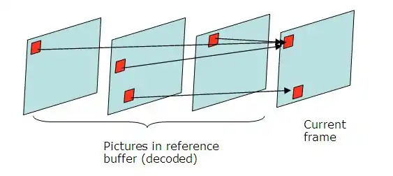 Múltiples referencias para poder hacer una estimación del movimiento. Permite buscar la mejor referencia en 2 los posibles buffers (List 0 para imágenes pretéritas, List 1 para imágenes futuras) que contienen hasta 16 frames cada uno. La predicción del bloque se haría mediante una suma ponderada de los bloques de las imágenes de referencia. Permite mejorar la calidad de la imagen en escenas donde hay cambios de plano, zooms o cuando se descubren nuevos objetos de secuencia.