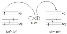 El oxígeno cede un electrón al Mn+4, el Mn+3 restaura el electrón. Al final del proceso, un electrón ha pasado de un metal al vecino, conservando su espín, y se favorece un acoplamiento ferromagnético entre ellos.