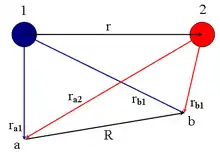 El canje o intercambio se produce entre dos electrones 1 y 2, ligados a los núcleos a y b.