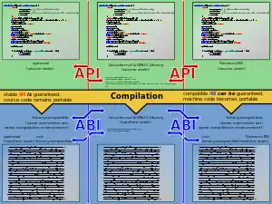 Las ABIs difieren de las interfaces de programación de aplicaciones (API) en que ambas definen interfaces entre componentes de programa pero las API a nivel de código fuente.