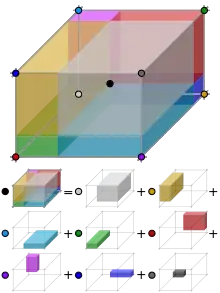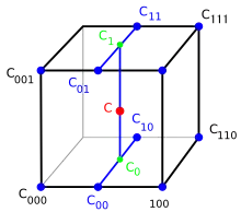 La interpolación trilineal es la extensión de la interpolación lineal,[1] que opera en espacios con dimensión , y de la interpolación bilineal, que opera con la dimensión , a la dimensión . Todos estos sistemas de interpolación utilizan polinomios de orden 1, lo que proporciona una precisión de orden 2, y requieren valores predefinidos adyacentes que rodeen el punto de interpolación. Hay varias formas de llegar a la interpolación trilineal, que es equivalente a la interpolación tridimensional tensorial de orden 1 con B-splines, y el operador de interpolación trilineal también es un producto tensorial de 3 operadores de interpolación lineal.[2]