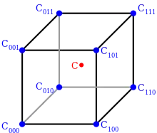 Las operaciones anteriores se pueden visualizar de la siguiente manera: Primero se localizan las ocho esquinas de un cubo que rodean al punto de interés. Estas esquinas tienen los valores , , , , , , , .