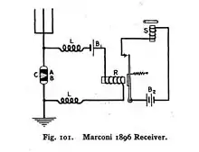 Guillermo Marconi estudió en la Escuela Técnica de Livorno y se familiarizó con los escritos publicados por el Profesor Augusto Righi de la Universidad de Bolonia.[91] En 1894, Sir William Preece entregó un documento a la Royal Institution de Londres sobre señalización eléctrica sin cables.[92][93] En 1894, durante las conferencias de la Royal Institution, Lodge entregó el documento titulado "El trabajo de Hertz y de algunos de sus sucesores".[94] Se dice que Marconi, mientras estaba de vacaciones en 1894, leyó artículos sobre los experimentos que Hertz hizo en la década de 1880, y también se informó sobre el trabajo de Tesla.[95] Fue en este momento cuando comenzó a comprender que las ondas de radio podían usarse para las comunicaciones inalámbricas. El primer aparato de Marconi fue un desarrollo del aparato de laboratorio de Hertz, convertido en un sistema diseñado con fines de comunicación. Al principio, usó un transmisor para hacer sonar una campana en un receptor del ático de su laboratorio. Luego trasladó sus experimentos al aire libre, a la finca familiar situada cerca de Bolonia, para establecer comunicación a mayores distancias. Reemplazó el dipolo vertical de Hertz por un cable vertical rematado por una lámina de metal, con un terminal opuesto conectado a tierra. En el lado del receptor, Marconi reemplazó el espacio de la chispa por un cohesor de limaduras metálicas, un detector desarrollado por Édouard Branly y otros experimentadores. Fue capaz de transmitir señales de radio a distancias de aproximadamente 2,4 km a finales de 1895.[96]