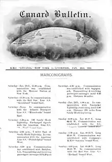 En 1904, Marconi inauguró un diario del océano, el Boletín Diario de la Naviera Cunard, en el R.M.S. "Campania" de la compañía naviera Cunard Line. Al principio, las noticias recibidas se imprimieron en un pequeño folleto de cuatro páginas titulado Boletín Cunard. En seguida pasó a llamarse "Cunard Daily Bulletin", con un subtítulo dedicado a los "Marconigramas Enviados al Barco".[124] Todos los barcos de pasajeros de la Compañía Cunard fueron equipados con el sistema de telegrafía inalámbrica de Marconi, mediante el que se mantenía una comunicación constante, ya fuera con otros barcos o con estaciones terrestres en el hemisferio este u oeste. El RMS Lucania, en octubre de 1903, con Marconi a bordo, fue el primer barco en mantener comunicaciones con ambos lados del Atlántico. El Cunard Daily Bulletin, un diario ilustrado de treinta y dos páginas publicado a bordo de estas embarcaciones registró noticias recibidas por telegrafía inalámbrica, y fue el primer periódico del océano. En agosto de 1903, se llegó a un acuerdo con el gobierno británico mediante el cual Cunard debía construir dos barcos de vapor, para que, con todos los demás barcos de Cunard, estuvieran a disposición del Almirantazgo británico para alquiler o compra, cuando fuera necesario. El gobierno otorgó préstamos a la compañía por valor de 2,6 millones de libras para construir los barcos, otorgándoles un subsidio de 150.000 libras al año. Uno fue el RMS Lusitania y otro fue el RMS Mauritania.[125]