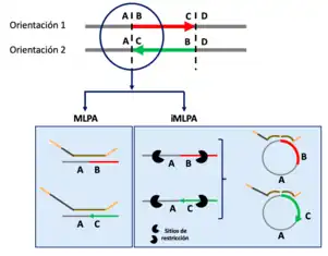 La técnica MLPA consiste en la amplificación múltiple de fragmentos de diferentes tamaños con cebadores comunes que suelen estar marcados con fluorescencia y que se pueden detectar por ejemplo mediante electroforesis capilar. Para realizar el genotipado de las inversiones mediante iMLPA, se puede seguir el protocolo característico de MLPA[4] realizando unas pequeñas modificaciones. La modificación del protolocolo consiste en utilizar dos pares de sondas marcadas que se unen específicamente en las secuencias de punto de corte de cada orientación, ya que cuando se produce una inversión esta puede darse en dos posibles orientaciones (orientación 1 (puntos de corte AB y CD) y orientación 2 (puntos de corte AC y BD)). Estas sondas deben hibridar en la región contigua a la zona de interés para poder detectar qué orientación tiene la inversión. Para el genotipado de inversiones que presentan inversiones repetidas (IR) u otras secuencias repetitivas en los puntos de interrupción de la inversión, se puede utilizar un nuevo método llamado iMLPA[5] que es resultado de una combinación de iPCR y MLPA. El genotipado por iMLPA requiere un procesamiento adicional del ADN: se realiza una digestión con enzimas de restricción que corten a cada lado de las secuencias repetitivas del punto de ruptura, posteriormente se autocircularizan y ligan de todas las moléculas de ADN digeridas. Los siguientes paso coinciden con en el genotipado por MLPA, utilizando de nuevo dos pares de sondas para poder determinar las orientaciones de las inversiones. Para validar el genotipado por MLPA e iMLPA puede repetirse el proceso por PCR/iPCR.