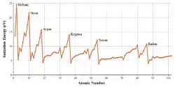 La tendencia de la energía de ionización de los átomos se utiliza a menudo para demostrar el comportamiento periódico de los átomos con respecto al número atómico, tal como se resume al ordenar los átomos en la tabla periódica de los elementos. Se trata de una valiosa herramienta para establecer y comprender el ordenamiento de los electrones en orbitales atómicos sin entrar en los detalles de las funciones de onda o del proceso de ionización. En la figura de la derecha se presenta un ejemplo. La disminución periódica abrupta del potencial de ionización después de átomos de gases raros, por ejemplo, indica la aparición de una nueva cáscara en metales alcalinos. Además, los máximos locales en el diagrama de energía de ionización, que se mueven de izquierda a derecha en una fila, son indicativos de las subcáscaras s, p, d y f.