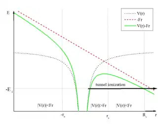 Keldysh[6] modeló el proceso MPI como una transición del electrón desde el estado fundamental del átomo a los estados Volkov.[7] En este modelo se desprecia la perturbación del estado básico por el campo láser y no se tienen en cuenta los detalles de la estructura atómica en la determinación de la probabilidad de ionización. La mayor dificultad del modelo de Keldysh era que no tenía en cuenta los efectos de la interacción de Coulomb en el estado final del electrón. Como se observa en la figura, el campo de Coulomb no es muy pequeño en magnitud comparado con el potencial del láser a mayores distancias del núcleo. Esto contrasta con la aproximación realizada despreciando el potencial del láser en regiones cercanas al núcleo. Perelomov et al.[8][9] incluía la interacción de Coulomb a distancias internucleares mayores. Su modelo (que llamamos modelo PPT) se derivó para un potencial de corto alcance e incluye el efecto de la interacción de Coulomb de largo alcance a través de la corrección de primer orden en la acción cuasiclásica. Larochelle et al.[10] han comparado las curvas de ionización frente a intensidad predichas teóricamente de átomos de gases raros que interactúan con un láser Ti:Sapphire con mediciones experimentales. Han demostrado que la tasa de ionización total predicha por el modelo PPT se ajusta muy bien a los rendimientos experimentales de iones para todos los gases raros en el régimen intermedio del parámetro de Keldysh.