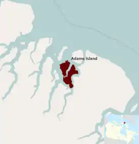 La isla Adams es de forma irregular, las partes oriental y occidental se encuentran divididas por el brazo Ratcliffe. Sus costas poseen pendientes fuertes, mientras que las montañas del interior alcanzan más de 800 m (2.600 pies) de altura.[2] La isla cuenta con un área de 267 km² (103 millas cuadradas).[3]