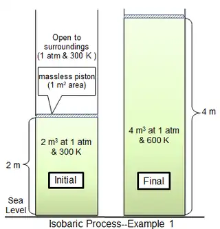 En el primer ejemplo de proceso, una cámara cilíndrica de 1 m² de área encierra 81.2438 mol de un gas diatómico ideal de masa molecular 29 g mol-1 a 300 K. El gas circundante está a 1 atm y 300 K, y está separado del gas del cilindro por un pistón delgado. Para el caso límite de un pistón sin masa, el gas del cilindro también está a 1 atm de presión, con un volumen inicial de 2 m³. Se agrega calor lentamente hasta que la temperatura del gas es uniformemente de 600 K, después de lo cual el volumen de gas es de 4 m³ y el pistón está 2 m por encima de su posición inicial. Si el movimiento del pistón es suficientemente lento, la presión del gas en cada instante tendrá prácticamente el mismo valor (psis = 1 atm) en todo momento.