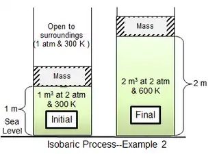 El segundo ejemplo de proceso es similar al primero, excepto que el pistón sin masa se reemplaza por uno que tiene una masa de 10,332.2 kg, que duplica la presión del cilindro de gas a 2 atm. El volumen de gas del cilindro es entonces de 1 m³ a la temperatura inicial de 300 K. Se agrega calor lentamente hasta que la temperatura del gas es uniformemente de 600 K, después de lo cual el volumen de gas es de 2 m³ y el pistón está 1 m por encima de su posición inicial. Si el movimiento del pistón es lo suficientemente lento, la presión del gas en cada instante tendrá prácticamente el mismo valor (p sis = 2 atm) en todo momento.