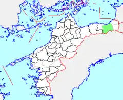 Limitaba con la ciudad de Kawanoe, el pueblo de Doi y la villa de Shingu (ambos en el distrito de Uma), todas en la prefectura de Ehime; y con las siguientes localidades de la prefectura de Kochi: los pueblos de Ootoyo (大豊町 Ootoyo-chō?) y Motoyama (本山町 Motoyama-chō?), ambos en el distrito de Nagaoka (長岡郡 Nagaoka-gun?); y el pueblo de Tosa (土佐町 Tosa-chō?) y la villa de Ookawa (大川村 Ookawa-mura?), ambos del distrito de Tosa (土佐郡 Tosa-gun?).