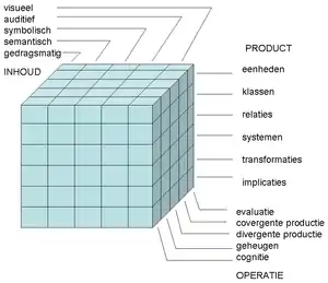 Es un modelo morfológico presentado en 1958 que intenta superar la visión restringida de las aptitudes que mostraban los modelos factoriales. Supone una clasificación cruzada de fenómenos que se interceptan. Se puede describir como una matriz matemática en tres dimensiones, similar a la tabla periódica de los elementos químicos de Mendeleyev. Toma como punto de partida un análisis de cómo actúa el sistema cognitivo al resolver problemas. Para ello establece tres categorías cuyas intercepciones dan lugar a cada aptitud: