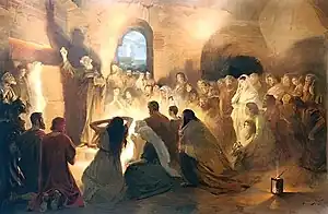 Tras su encargo en 1894, Styka viajó a Jerusalén para preparar bocetos y a Roma, donde su paleta fue bendecida por el Papa León XIII.[5][6]