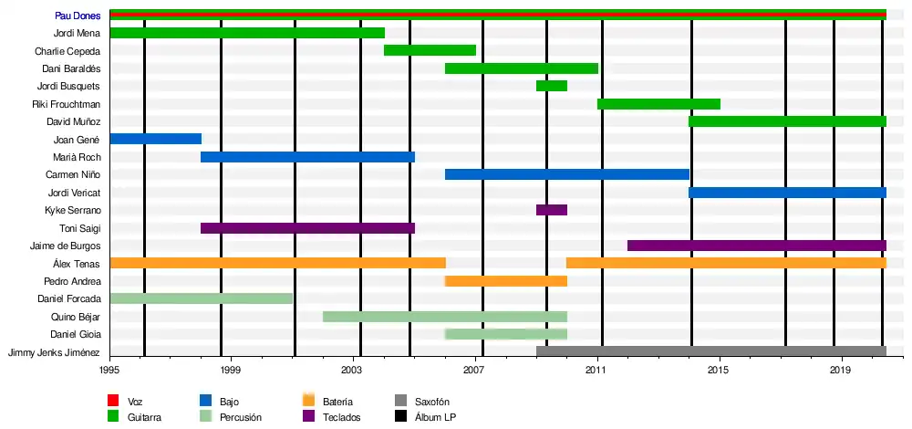 - Pau Donés (1995-2020): voz, guitarra eléctrica, guitarra acústica