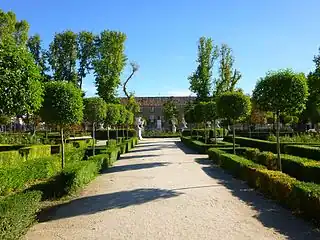 Presenta un esquema en forma de cruz, con dos calles perpendiculares unidas en una plaza circular. Estas calles se acompañan de platabandas laterales arboladas. Cada cuadro resultante se divide a su vez en cuatro cuadros gracias a dos calles paralelas al lado mayor (plaza de San Antonio), otra paralela a la calle Real y otra, no paralela, a la calle de las Infantas. Todas estas calles son de tierra y tanto los cuadros como las platabandas se bordean con mirto.[1][2]