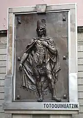 Totoquihuatzin: "Entrada de aves".Autor Jesús F. Contreras 1866-1902, procedencia: formó parte de la colección del museo nacional de la artillería. Alto relieve en bronce 1888-1889, 360 x 225 cm.