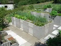En el mercado también hay soluciones prefabricadas para canteros de jardín elevados que están hechas de polietileno de larga duración que es estabilizado con UV y de grado alimenticio para que no filtre químicos indeseables en el suelo ni se deteriore en los elementos. Una pared de panel doble proporciona una bolsa de aire de aislamiento que minimiza las fluctuaciones de temperatura y el secado del suelo en el cantero. A veces, los jardines de canteros elevados están cubiertos con plástico transparente para proteger los cultivos del viento y las fuertes lluvias.[8] Pre-manufactured raised bed gardening boxes also exist.[9] Hay variantes de madera, metal, piedra y plástico.