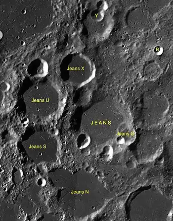 Por convención estos elementos son identificados en los mapas lunares poniendo la letra en el lado del punto medio del cráter que está más cerca de Jeans.