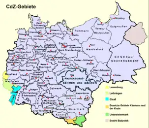Varias divisiones administrativas bajo la autoridad de un Jefe de la Administración Civil fueron designadas oficialmente como CdZ-Gebiete (Áreas CdZ, Jefe de los Territorios de la Administración Civil):[1][2]