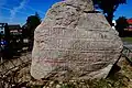 “El Rey Harald ordenó construir este monumento en honor a Gorm, su padre, y a Thyra, su madre; el mismo Harald que para sí conquistó toda Dinamarca y Noruega, y a los daneses hizo cristianos.”