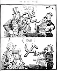 En Yalta, Stalin, a modo de dios Vulcano, recibe del tío Sam y de John Bull la Europa de la cruz gamada nazi y la transforma en la Europa de la hoz y el martillo comunista.
