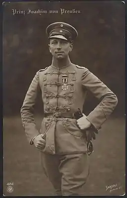 Príncipe Joaquín de Prusia (17 de diciembre de 1890 - 18 de julio de 1920) fue el hijo menor del Káiser Guillermo II de Alemania y de su primera esposa, la Princesa Augusta Victoria de Schleswig-Holstein. Candidato a tronosDurante el Alzamiento de Pascua en Dublín, Irlanda, en 1916, algunos líderes republicanos pensaron ofrecer el trono de una Irlanda independiente al príncipe Joaquín.[1][2] Después de la declaración de independencia de Georgia a continuación de la Revolución rusa de 1917, Joaquín fue considerado brevemente por el representante alemán Friedrich Werner von der Schulenburg y los realistas georgianos como candidato al trono de Georgia.[3] MatrimonioEl príncipe Joaquín se casó el 11 de marzo de 1916 con la princesa María Augusta de Anhalt (10 de junio de 1898 - 22 de mayo de 1983), hija de Eduardo, duque de Anhalt y su esposa, la princesa Luisa de Sajonia-Altenburgo, hija a su vez del príncipe Mauricio de Sajonia-Altenburgo.[4] La pareja tuvo un hijo, el príncipe Carlos Francisco (Potsdam, 15 de diciembre de 1916 - Arica, Chile, 22 de enero de 1975). Vida adultaDespués de la abdicación de su padre, Joaquín fue incapaz de aceptar la nueva situación que lo relegaba a un ciudadano común, lo cual le sumió en una profunda depresión, y finalmente se suicidó el 18 de julio de 1920 en Potsdam. Otras fuentes apuntan que tenía unas deudas considerables debido a la gran depresión nerviosa que sufría.[5] Su propio hermano, el príncipe Eitel Federico de Prusia, comentó en su momento que había sufrido un "acceso de demencia desorbitada".[5] La pareja se había divorciado poco antes de su fallecimiento. Las causas reales no se han hecho aún públicas, sólo se sabe que el matrimonio no tuvo nunca problemas conyugales antes del anuncio de divorcio,[6] más allá de las razones, esto pudo motivar su depresión. Hijo y nietosCarlos Francisco de Prusia (Potsdam, Alemania, 15 de diciembre de 1916 - Arica, Chile, 22 de enero de 1975) se casó en primeras nupcias el 5 de octubre de 1940 con la princesa Henriette Hermine von Schönaich-Carolath (25 de noviembre de 1918 - 16 de marzo de 1972). Se divorciaron el 5 de septiembre de 1946. Tuvieron tres hijos: