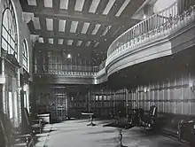 John Jay Hall se diferenciaba notablemente de sus contemporáneos institucionales de Morningside Heights. Johnson (ahora Viena) y Hewitt Halls se construyeron para albergar a estudiantes de posgrado de Columbia y estudiantes universitarias de Barnard College, respectivamente. Ambos emplearon acabados de madera más claros y arquitectura neocolonial "estadounidense temprana", que se cree que refleja el ambiente cómodo y doméstico al que las mujeres deberían estar expuestas. Por el contrario, John Jay Hall presentaba paneles y vigas de madera oscura en el techo, así como otros detalles que se pensaba que lo convertían en una estructura más "masculina". [1]