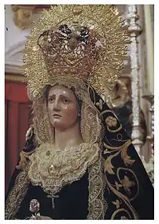 Esta dolorosa, al igual que la de Jerez o la de Fuente de Andalucía, es de candelero y tiene las manos entrelazadas, en señal de recogimiento. Solo están tallados el busto, las manos y el inicio de los brazos siendo el resto láminas de maderas. Presenta un rostro que no se ve descompuesto por el menor rictus, mostrando un dolor interiorizado, sereno, en definitiva un estado de ánimo más intuido que expreso. La concepción responde a los supuestos estéticos e ideológicos propugnados por la Real Academia de Bellas Artes de San Fernando, el estilo neoclásico, que en esa época fueron recogidos en Cádiz por la Academia de Bellas Artes local y por lo tanto por sus representantes, uno de los cuales, como ya hemos citado, era Fernández Guerrero.