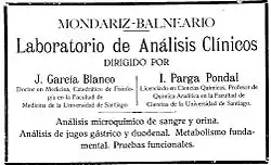 El Dr. D. José García Blanco, catedrático de Fisiología Humana en la Universidad de Santiago y director del Instituto de Nutrición del Establecimiento pasaba consulta en los altos de La Baranda como especialista en enfermedades de la nutrición y además se encargaba de realizar pruebas complementarias funcionales de nutrición y Rayos X...[17]Historia del Balneario de Mondariz hasta 1936, Mª Jesús del Castillo Campos
