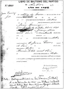 La partida de nacimiento de Perón indica que nació el 7 de octubre de 1895 en tanto que la Ley n.º 25 518 de 2001 declaró que su casa natal fue un inmueble ubicado en la ciudad de Lobos. Sin embargo se ha considerado tradicionalmente que Perón nació un 8 de octubre de 1895,[9] en tanto que destacados historiadores, sostienen que Perón nació dos años antes de lo que indica su partida, en 1893, en Roque Pérez.[10][11][12][13]