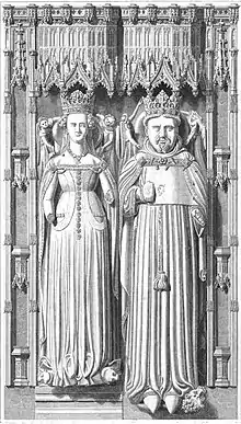 ![]() Juana de Navarra, Reina de Inglaterra y duquesa viuda de Bretaña, junto a su hijo Arturo, futuro Arturo III de Bretaña, junto a la tumba de su marido y su padre, el duque Juan V de Bretaña. | ||