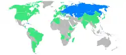 Afganistán, Alemania Occidental, Alemania Oriental, Angola, Argelia, Argentina, Austria, Bélgica, Brasil, Bulgaria, Canadá, Checoslovaquia, China, Colombia, Corea del Norte, Cuba, Dinamarca, España, Estados Unidos, Etiopía, Finlandia, Francia, Gran Bretaña, Grecia, Guyana, Hungría, India, Italia, Japón, Laos, Líbano, Madagascar, Marruecos, Mongolia, Nicaragua, Noruega, Países Bajos, Peru, Polonia, Portugal, Rumania, Siria, Suecia, Suiza, Tanzania, Unión Soviética, Venezuela, Vietnam, Yemen del Sur, Yugoslavia y Zimbabue.