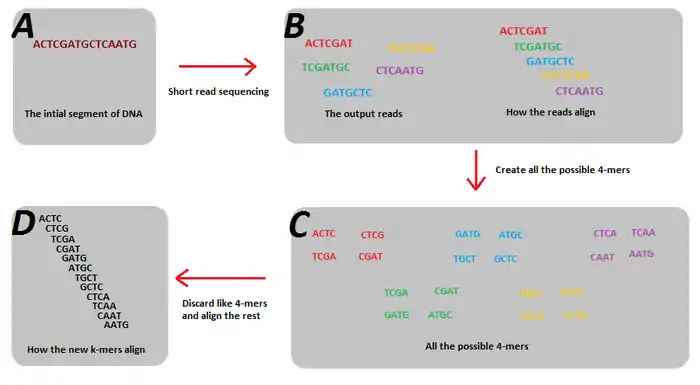 La solución a este problema es dividir las lecturas en k-meros más pequeños, de modo que estos representen todos los posibles k-meros de ese tamaño más pequeño presentes en el genoma.[27] Por otro lado, dividir los k-meros en tamaños más pequeños también ayuda a aliviar el inconveniente de tener diferentes longitudes de lectura. En este ejemplo, las cinco lecturas no representan todos los posibles heptámeros del genoma y, como tal, no se puede crear un gráfico de De Bruijn. Empero, cuando se dividen en tetrámeros, las subsecuencias resultantes son suficientes para reconstruir el genoma usando un gráfico de De Bruijn.
