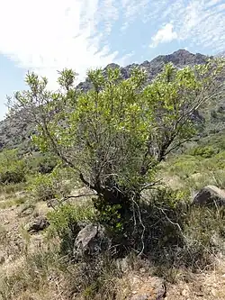 Se halla a altitudes de 800 a 3000 m s. n. m.; es un árbol perennifolio, de 4-7 m de altura, follaje ralo, hojas alargadas, aserradas.