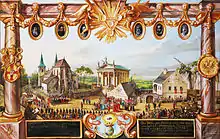 Se puede ver la plaza de la iglesia de Kaisersteinbruch, a la derecha la casa parroquial, a la izquierda la iglesia con la capilla encargada por el emperador. El artista ha entrelazado dos niveles temporales, el de las personas del siglo XVII, reconocibles por su vestimenta, y el de las personas del presente (siglo XIX) paseando por la plaza de la iglesia. Algunas personas del pasado tienen gran parecido a las de hoy. Aunque los actores de distintas épocas estén cerca unos de otros, no puede haber contacto.
